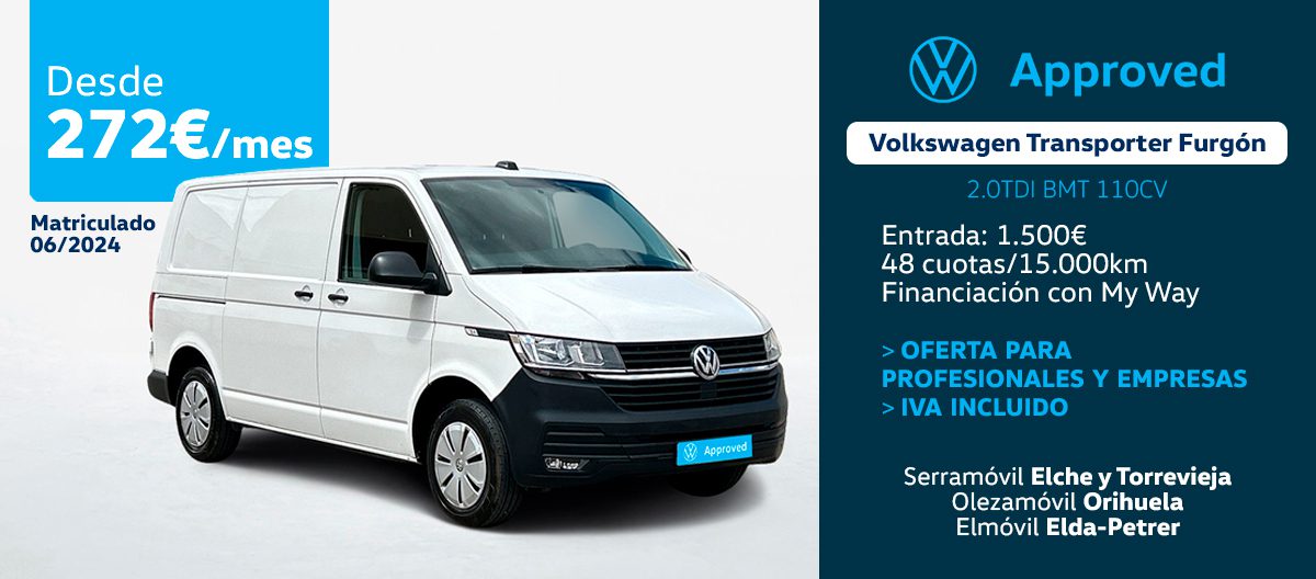 PVP recomendado en Península y Baleares de 28.900,00 € para un Volkswagen Transporter Furgón 2.0TDI BMT 81kW (IVA, transporte, impuesto de matriculación, descuento de marca y concesionario incluidos), financiando a través de Volkswagen Financial Services según condiciones contractuales. Com. de apertura: 3,50% (959,00€). TIN: 6,99%. Importe total adeudado: 13.074,24€. Este precálculo se emite a efectos meramente informativos, sin tener carácter de oferta vinculante y sin sustituir a la información precontractual regulada en la ley de Contratos de Crédito al Consumo. La aprobación de estas condiciones de financiación estará sujeta al estudio de la valoración económica del cliente por parte de Volkswagen Financial Services. Volkswagen Financial Services es una marca comercializada por Volkswagen Bank GmbH S.E.. Avda. Bruselas, 34 – 28108 Alcobendas (Madrid) Reg. Mercantil de Madrid. Tomo 16828, Sección 8, Folio 184, Hoja M-287573, Inscrita con el nº 1480 del Reg. Especial del Banco de España – CIF. W-0042741I
